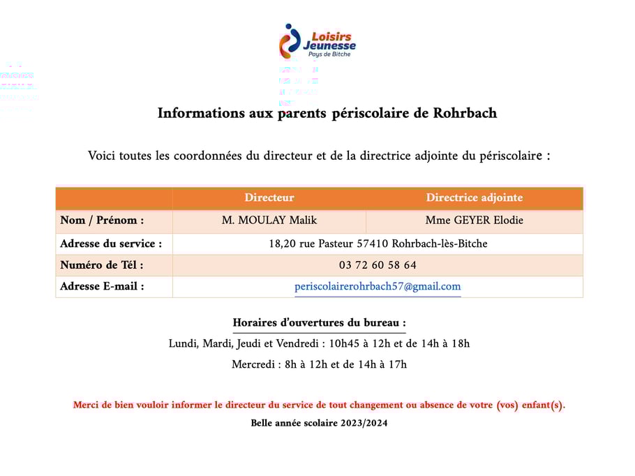Nos équipes vous souhaitent une agréable journée en notre compagnie et vous invitent également à suivre la page facebook du service pour plus d'actualités (Périscolaire de Rohrbach).