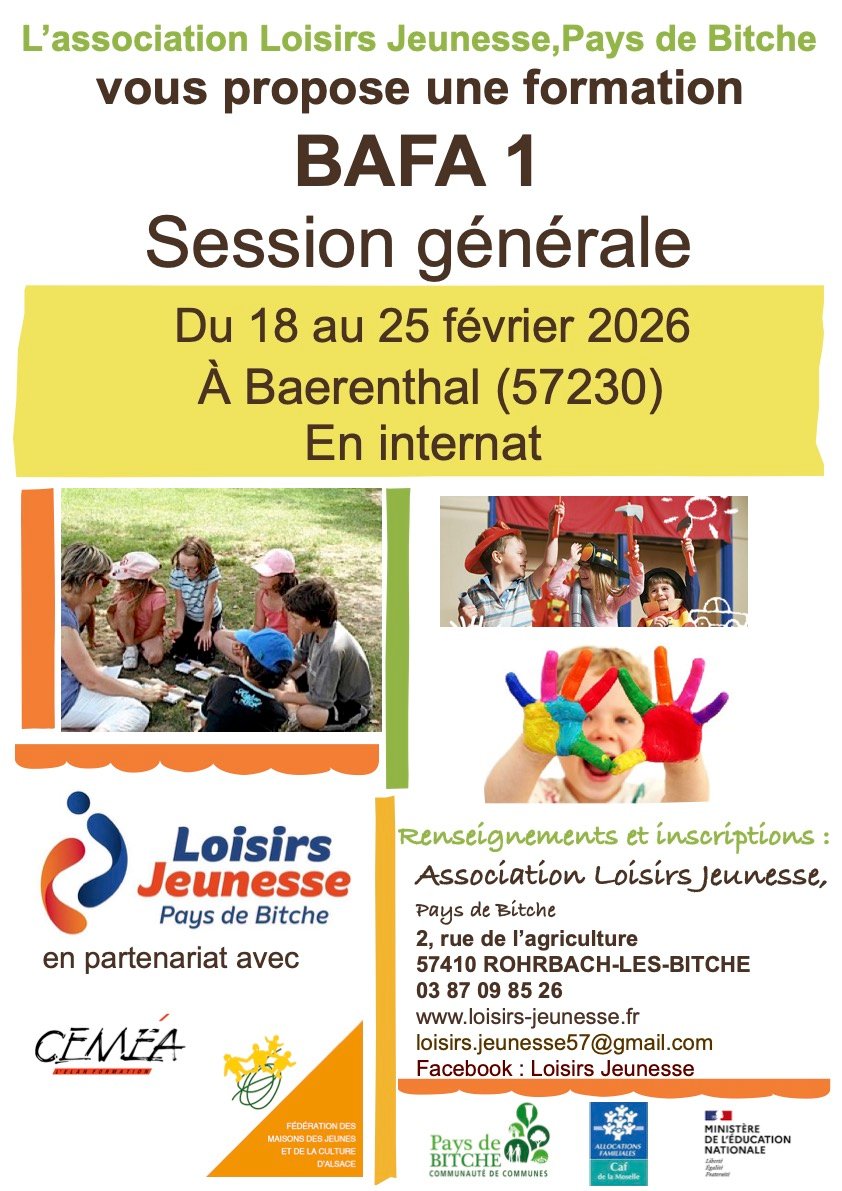 Vous trouverez ci-dessous en téléchargement les dossiers d'inscriptions pour notre prochaine formation BAFA (générale) qui se tiendra en Février à Baerenthal.